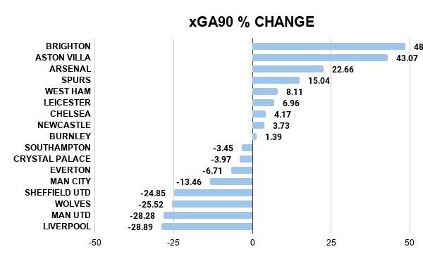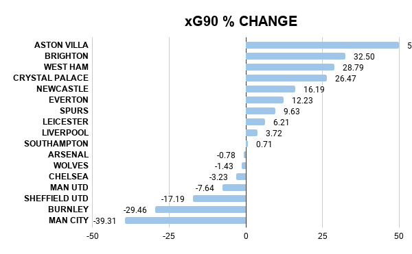 Another side that barely escaped relegation last season that have been a revelation thus far this term. Here, the changes to the xG/xGA90 figures are more marginal than they are in Villa’s case but still represent a marked improvement in performance.