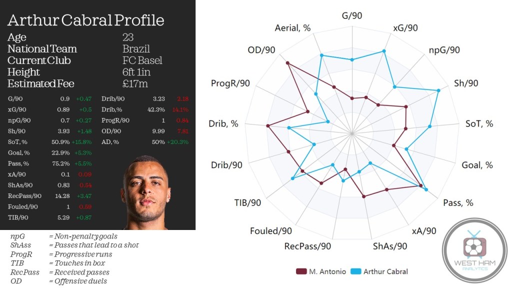 The only drop-off we should expect to see from Cabral is around his ball-carrying. Unlike Antonio, Cabral is not a converted winger, and as such he is much less confident charging up the pitch with the ball and taking on his man. Antonio averages 5.57 dribbles per 90 and beats his man 56.9% of the time, whereas Cabral only attempts 3.23 dribbles with a success rate of 42.3%. Similarly, Cabral only makes one progressive run per 90, whereas Antonio is averaging 2.2 this season. Honestly though, a striker whose heatmap is largely central and situated in and around the box is arguably what we need on our counters, someone with decent hold-up-play who can lay it off to breaking players and make a run into the box.