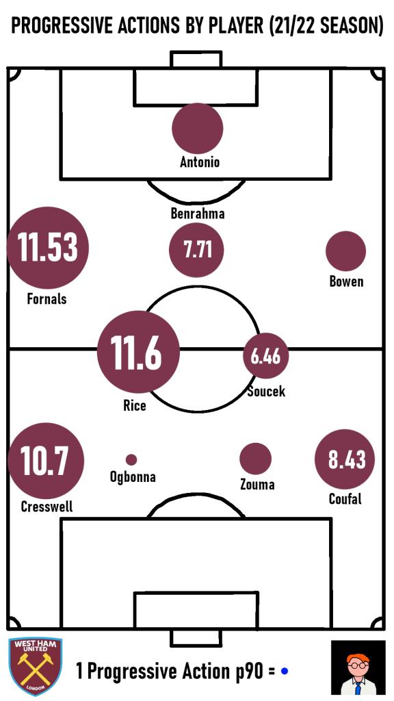 That said, what Estupiñán might lack in passing ability he more than makes up for with his crossing and confidence in taking on his man. His cross completion rate of 29.4% is considerably better than Cresswell’s 17.9% and when a cross isn’t on, Estupiñán is more than capable of dribbling past a defender and using his electric pace to dart to the byline. While Cresswell is yet to complete a single successful dribble in the league this season, Estupiñán is beating his man as regularly as Jarrod Bowen.
