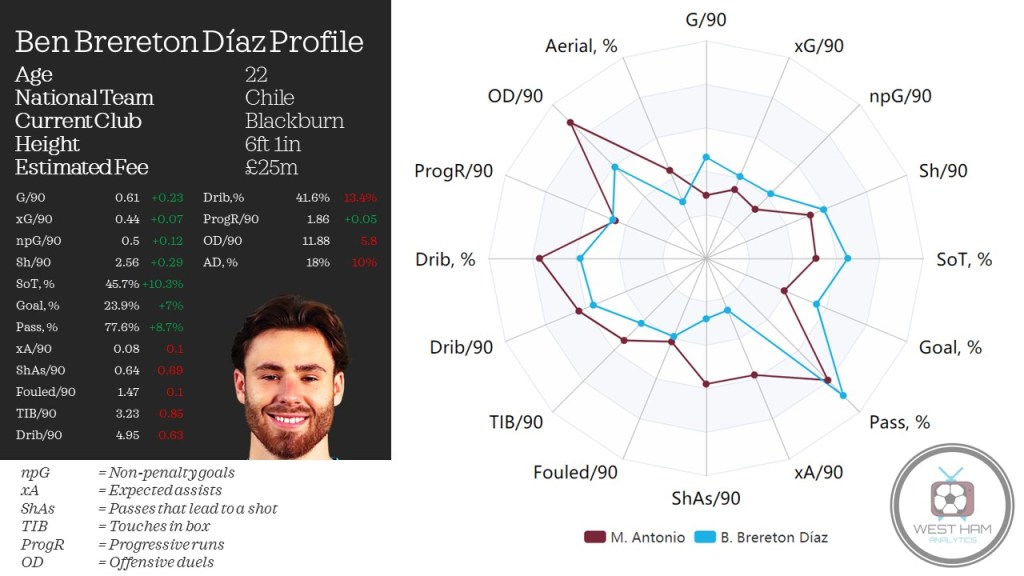 Brereton Díaz can make things happen in possession too, and his metrics suggest that he would be more than capable of leading our counter-attacks. Remarkably, he is actually averaging an almost identical number of progressive runs (1.89) per 90 as Antonio (1.88) this season, an impressive return. Though dribbling is an area where Antonio is superior with the Jamaican boasting an impressive dribble success rate of 54.7% (>41.6%) whilst attempting more dribbles (5.64>4.95) per 90.