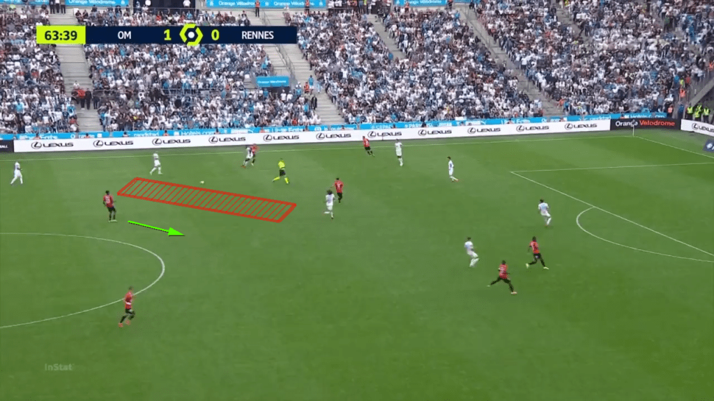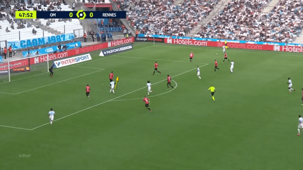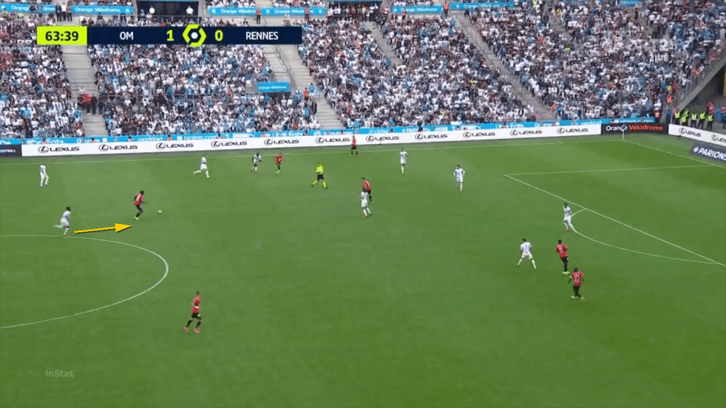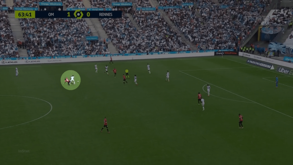Another area of Dieng’s game that is undoubtedly strong is his off-the-ball work. Whilst he’s not the most frequent or successful presser, his tackling is exceptional for a forward and his 3.07 tackles and interceptions combined per 90 place him in the top 1% of strikers in Ligue 1 for sheer volume of defensive output. He’s noticeably good at recognising when the opposition defensive midfielder doesn’t have an immediate passing option and rushing in with a perfectly timed tackle to spring a counter-attack. There was a good example of this, again from the Rennais game, when Dieng raced back to challenge Lesley Ugochukwu and sprung a promising counter for his team.