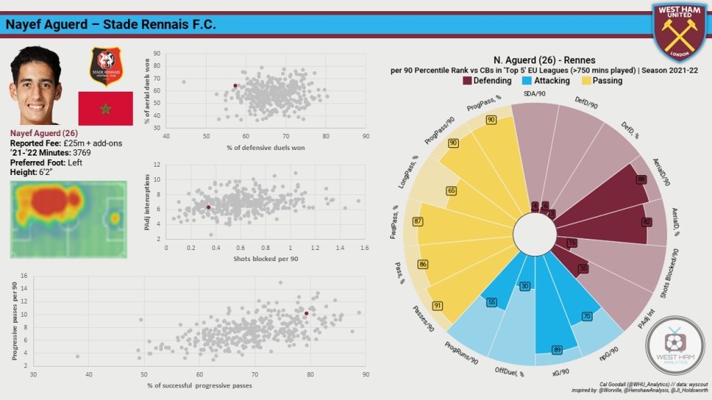 To put this metric into context, the most progressive centre-back at West Ham in 2021-22 was Angelo Ogbonna, completing 4.1 progressive passes per 90 (79.3% of 5.2 attempts), followed by Craig Dawson (3.9 per 90; 69.2% of 5.7 attempts). Aguerd, completing more than double the number of progressive passes per game than any of our centre-backs averaged last season, will be a welcome addition in possession, particularly as we transition away from our dependency on Aaron Cresswell in build-up. Looking more broadly for a comparison, Aguerd is in good company, as there are only a handful of centre-backs that completed a similar percentage (>80% from 10+ attempts) of their progressive passes in 2021-22, including Aymeric Laporte, Sergio Ramos, Ibrahima Konaté, and Thiago Silva.
