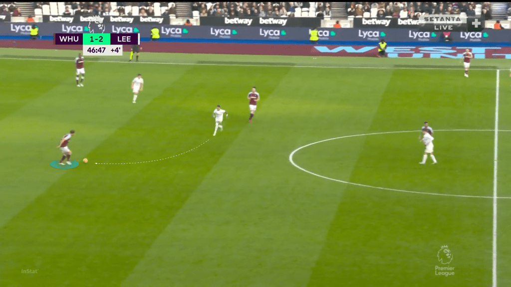 Although these actions can be high risk, West Ham have desperately lacked a truly press-resistant progressive passer in central defence under David Moyes and the arrival of Aguerd will surely ease some of the progressive burden on the full-backs and allow us to build up play more fluently. One of the obvious issues when looking at the results from last season is the difficulty Moyes’ side had when facing sides that execute effective pressing systems. West Ham were only able to win three of their eight fixtures in all competitions against Leeds, Brighton and Southampton. Moyes will be hoping that by adding progressive excellence to the backline his team can improve results against this kind of opposition.